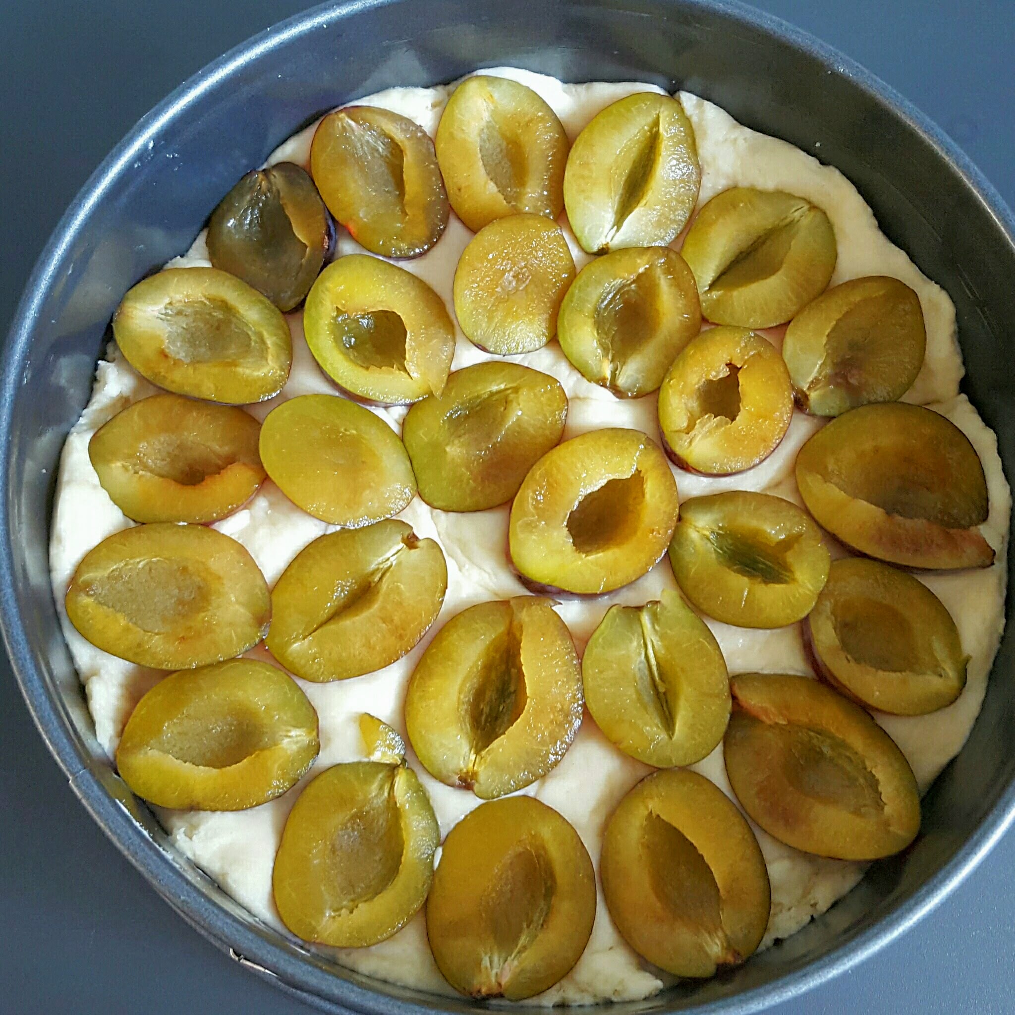Die Pflaumen abwaschen, entkernen, halbieren und auf den Teig verteilen.