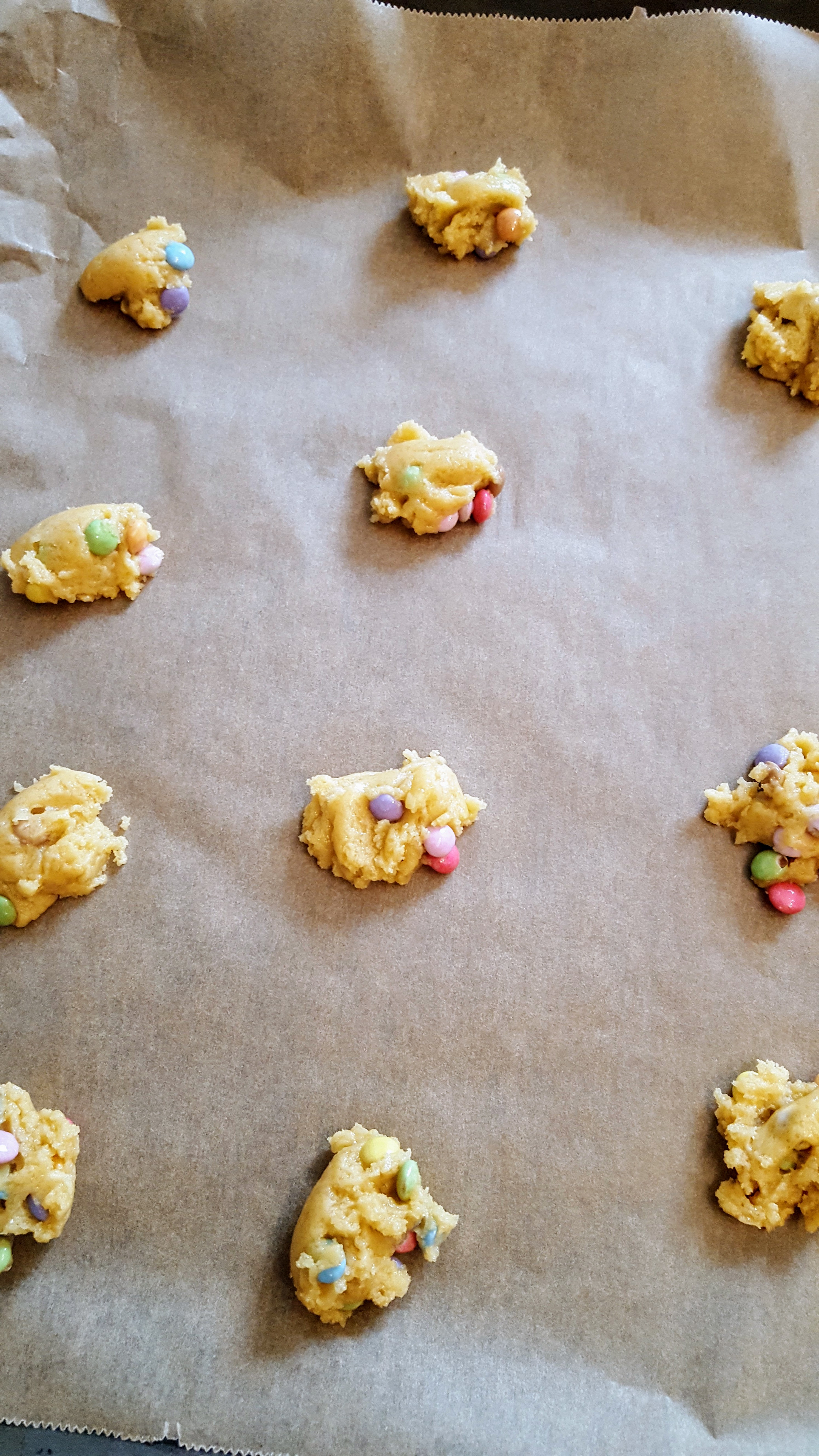 Für den Teig einfach alle Zutaten miteinander vermengen und zum Schluss die Smarties unterheben. Walnussgroße Portionen auf das Backblech geben und die Cookies ungefähr 12 Minuten goldbraun backen.